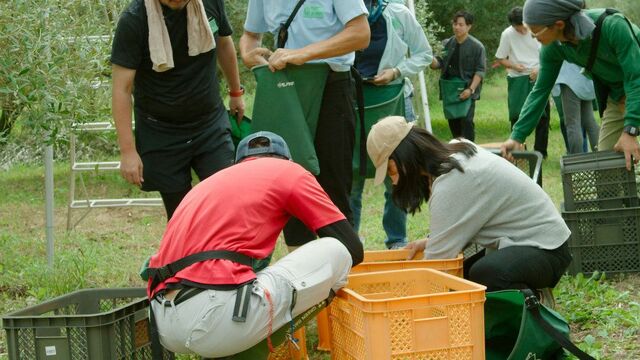 突然の“ノルマ宣告”に一瞬、うろたえた参加者一行だが、収穫が始まると、皆が無言で作業に没頭した。ノルマももちろん頭にあったが、青い空の下、吹き抜ける心地よい風を感じながら体を動かし、黙々と青い実を摘み取る作業には、人を夢中にさせる何かがある。実りの時期の畑は美しく、適度な、しかし都会の日常生活では得難い運動量には気持ちをポジティブにさせる心地よさがあり、手を動かした分だけ、青い実がカゴを満たしていく、その充実感もたまらない。