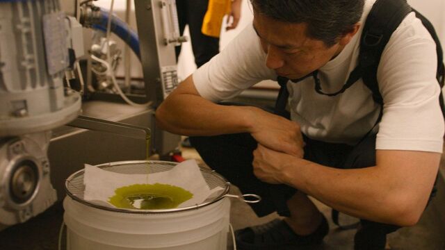 青々とした搾りたてのオリーブオイルと、搾油の様子にくぎ付けの「ラ クレリエール」柴田シェフ。