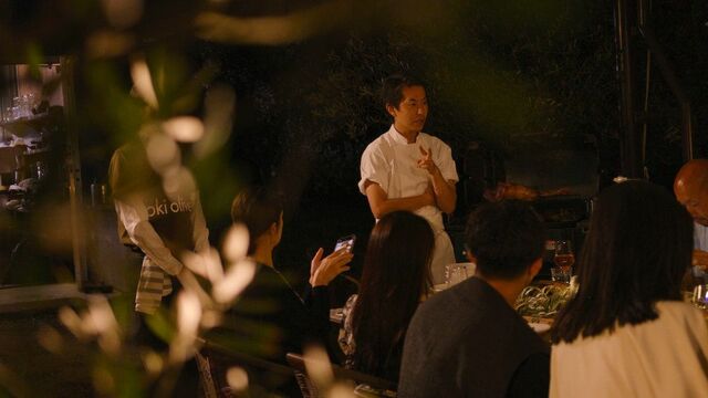 柴田シェフは店でも「澳オリーブ」のオリーブオイルを愛用する。畑の中の一夜限りのレストラン。