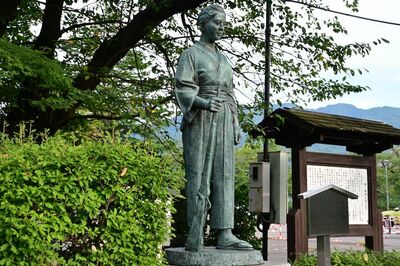 巌流島に立つ宮本武蔵と佐々木小次郎の像