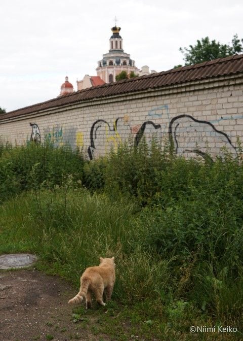 聖カジミエル教会の裏通り、舗装されていない小道は通る人もあまりありません。猫が散歩の足を止め、草のにおいを嗅いでいました。