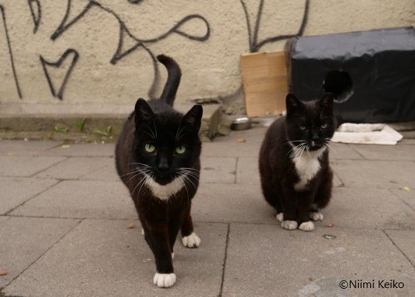 大きなアパートと公園の間に、猫の小さな家がありました。世話をする人がまだ来てなかったようで、人恋しそうに猫が近寄ってきました。