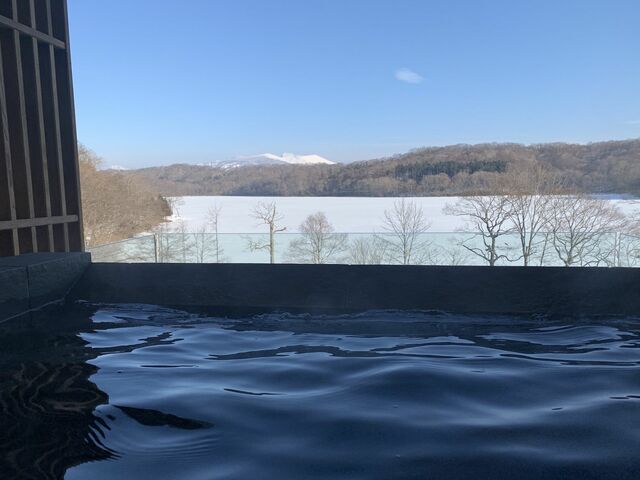 客室露天風呂から結氷したポロト湖や雪の樽前山が眺められる