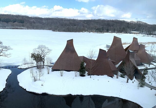 湖畔に立つ三角屋根の建物は、男女別の温泉浴場「△湯(さんかくのゆ)」がある湯小屋。丸太を組んだ三脚で屋根を支えるアイヌ民族の建築「ケトゥンニ」を基本構造にしている。内部はトドマツの丸太で組まれ、高さは9.5メートルある。