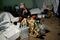 1月5日、ウクライナ東部のドンバス地方のシェルターの中で、ブランケットにくるまって寒さをしのぐ男性(写真:ロイター/アフロ)