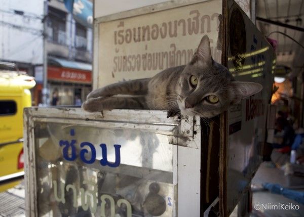 大きな市場の入り口にある時計などの修理をするブースにいるのは、市場の中にある軽食堂の猫です。いつも看板&目印になってくれていて、通行人から話しかけられたりするから猫はいるのがいいね、とのことでした。