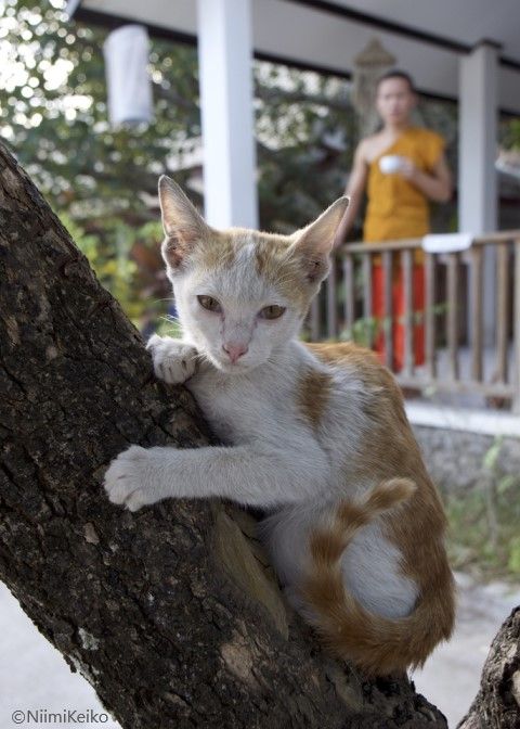 まるで蝉のように、子猫が木に止まっていました。「子猫は木登りの練習をしているところで、ただいま休憩中」だと、午後のティータイム中の小僧さんが話してくれました。