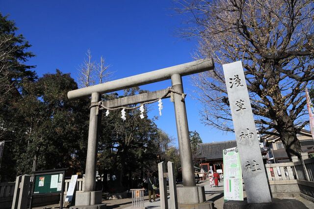 浅草寺創建にまつわるストーリーを頭に入れた上で宝蔵門をくぐる。通常はまっすぐ浅草寺の本堂に向かうところだが、今回は、その右側にある鳥居に注目。これが浅草神社である。