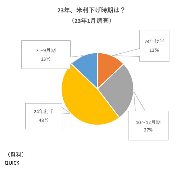この点、米利上げ停止時期については2023年1~3月期と4~6月期で計78%に達しているが、利下げ開始時期については計61%が2024年以降と予想する(図表①・②)。