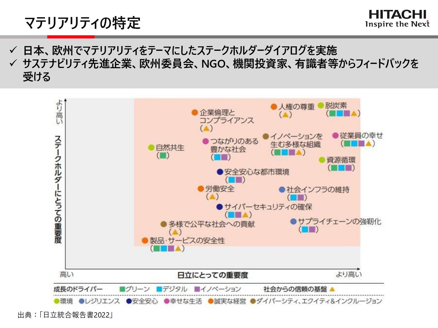 サステナビリティに必要な項目を日立とそのステークホルダーの視線で徹底評価。優先順位を決定した拡大画像表示