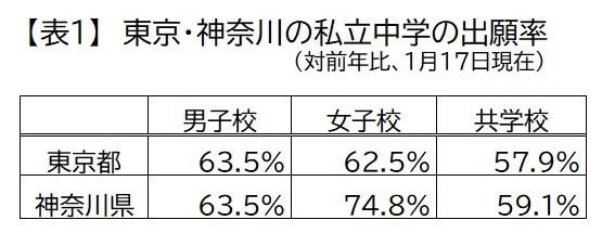筆者は仕事柄、東京の私立中学の出願が始まる1月10日以降、毎日のように出願状況をチェックしているが、1週間が経過して気づいたことがある。昨年の最終出願者数と比較した出願率(1月17日時点でどのくらいの出願があったか)を算出したところ、共学校よりも男子校や女子校の出願率が高かったのだ。東京と同じく2月1日に入試がスタートする神奈川も同様の傾向が見られた(【表1】参照)。