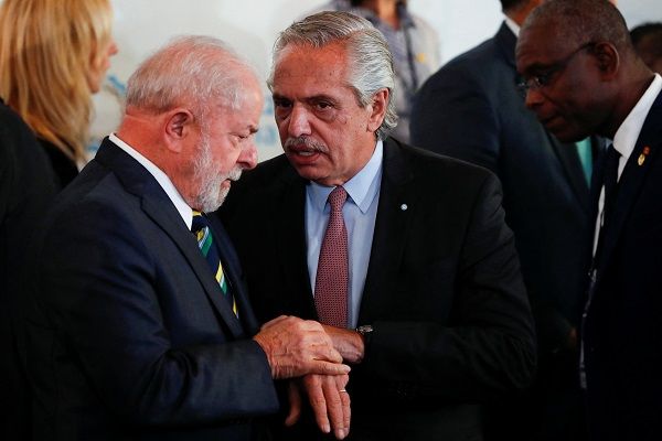 共通通貨構想をぶち上げたブラジルのルーラ大統領(写真手前左)とアルゼンチンのフェルナンデス大統領(同右)(写真:ロイター/アフロ)