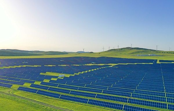 中国は太陽光発電の分野でも圧倒的なシェアを持つ。写真は内モンゴル自治区に設置された太陽光発電パネル。奥には風力発電も(写真:Costfoto/アフロ)