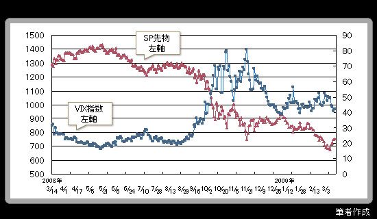 ところが、2009年2月以降のSP先物の下落過程では、VIX指数の上昇が見られない。株式投資家には、暴落への恐怖心が芽生えなかったと推測される。経済指標の悪化に伴い、当局が多少なりとも対策を講じた結果であろう。
