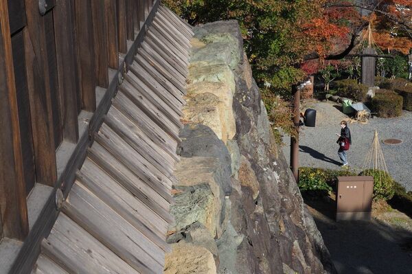 天守台の周りを、注意深く一周してみよう。石垣は、自然石や粗割り石をランダムに積み上げた野面(のづら)積みだ。