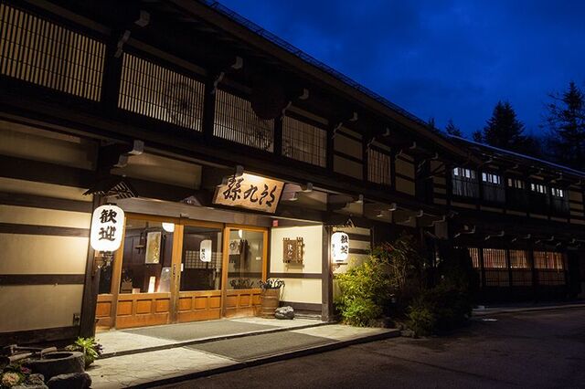 「元湯 孫九郎」は通りに面して、重厚な木造平入屋敷がたたずむ。先祖代々の住まいであった築150年の民家を、1968年から宿屋として使用し営業している。現在はロビーとなっている吹き抜けの建物は、同じ村から移築した古民家だという。縦横に走る太い梁や囲炉裏の喫茶スペースを抜けて客室へと向かう。