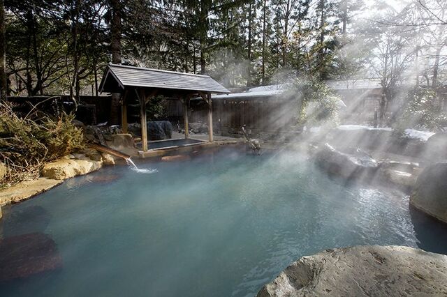 朝の光が降り注ぐ露天風呂で爽快な湯浴みが楽しめる