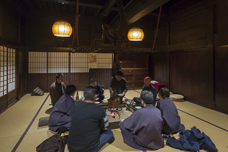 朝食後に、徒歩すぐにある「舎湯(やどりゆ)」でくつろぐのもいい。ここは福地温泉の宿泊者だけが利用でき、大きな囲炉裏や足湯がある。若旦那衆が地酒や鍋をふるまう冬のイベント・あつ鍋(写真)で知られる場所だ(コロナ禍、開館・開催は要問い合わせ)。
