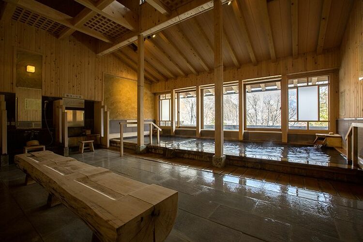 新装された木造りの内風呂「大湯」では、露天風呂とは異なる泉質のナトリウム-炭酸水素塩泉が注がれる。こちらは無色透明。ぬる湯とあつ湯のふたつの浴槽があり、交互に入ることで新陳代謝が高まる。飲泉もでき、市販の胃腸薬とほぼ同じ成分という。洗い場には女将のアイデアの「髪洗いの湯」が設けられ、弱酸性の湯で髪を洗うと仕上がりがふんわりと軽い。貸し切りの内湯も快適だ。