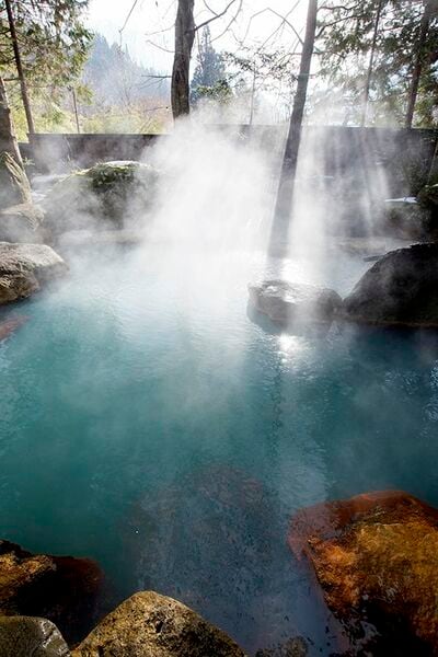 「元湯 孫九郎」は自家源泉を4本所有し、独自のシステムで加水・加温なしの源泉100%掛け流しを、全館6つの浴槽で行っている。これは豊富な湯量と湯守りの情熱が成せる技だ。野趣あふれる露天風呂は男性用と女性用と貸し切りの3か所がある。泉質は単純温泉で、肌を整える美肌の湯と好評だ。緑褐色のにごり湯で、目でも楽しませる。