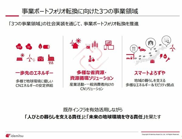 具体的には3つの事業領域にフォーカスします。まず「一歩先のエネルギー」では、カーボンニュートラルに資するエネルギーの安定供給を進めます。2つ目の「多様な省資源、資源循環ソリューション」ではお客さまの事業形態や使い方によって最適なエネルギーミックスを提供し、資源循環に資するソリューション提供を目指します。3つ目の「スマートよろずや」は、最大の顧客接点であるサービスステーション(ガソリンスタンド)のネットワークを地域の暮らしを支えるエネルギーやモビリティのサービス拠点へと変えていきます。