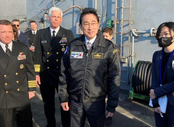 昨年11月、海上自衛隊の国際観艦式で、米空母ロナルド・レーガンにヘリで乗り込んだ岸田文雄首相(写真:ロイター/アフロ)