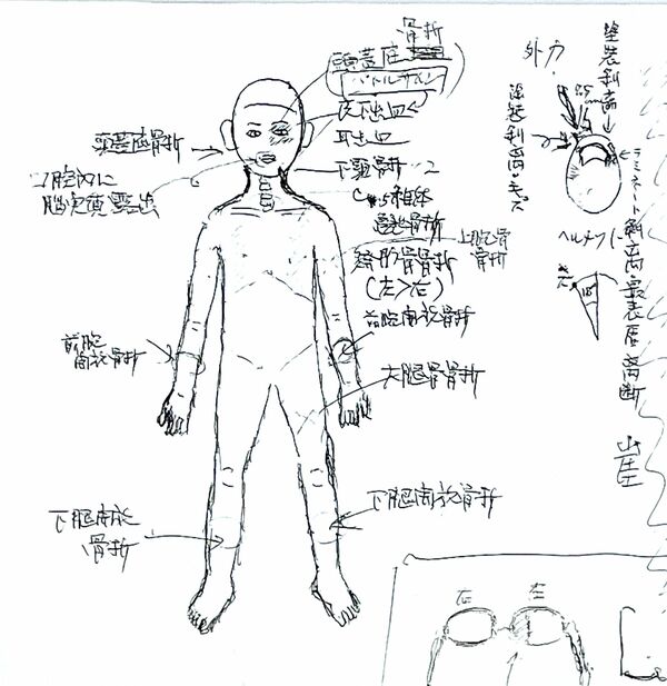 下記の図は、外科医である節男さんが、禎三さんの遺体の損傷をメモしたものです。