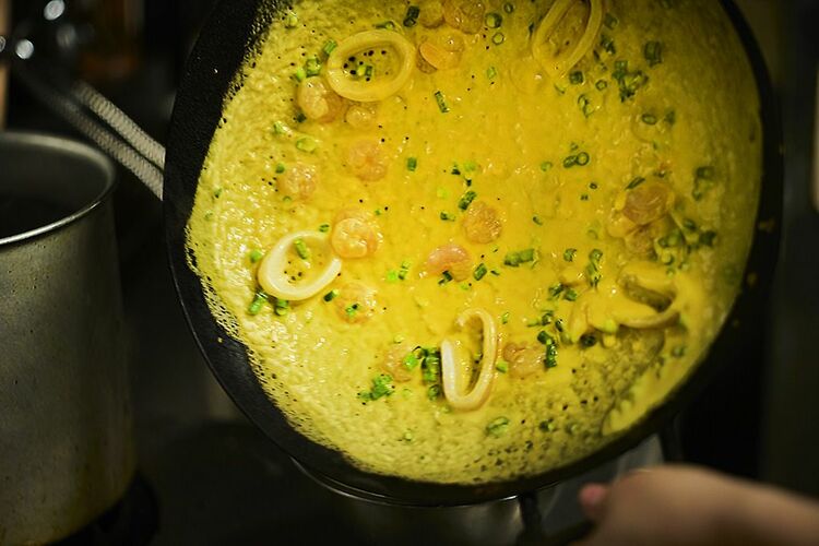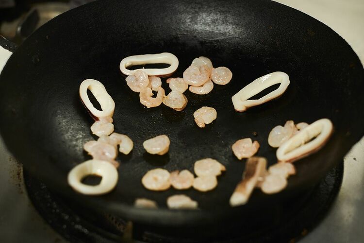 3. フライパンを強火で熱し、サラダ油を注いで海老とイカを炒める。火が入って色が変わったら、1の生地を注ぎ入れ、フライパンを傾けながら薄く均一に広げる。