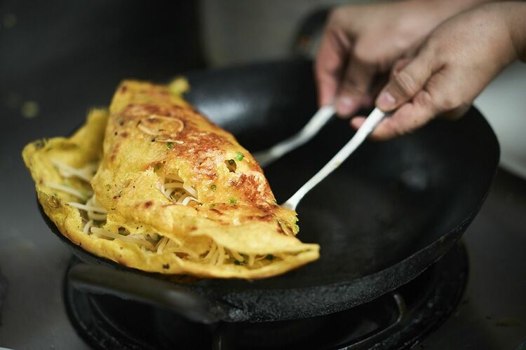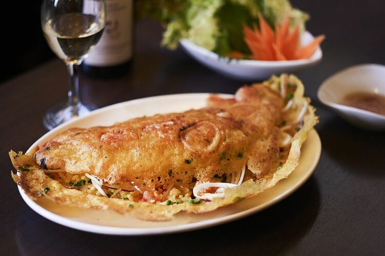 見た目から、ベトナム版お好み焼きと紹介されることが多いが、生地が米粉やココナッツミルクからなるうえに、一口大にカットしてパクチーやミント、大葉とともに葉野菜に包んでいただく点で、趣がかなり異なる。