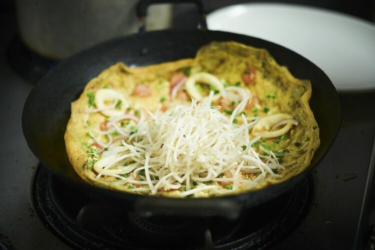 6.5に湯通ししたもやしをのせる。ふちにしっかりと焼き色が付き、フライパンから浮き上がって生地全体がパリっと仕上がったら、フライ返しなどで手前から持ち上げ、二つ折にして皿に盛り、サニーレタスやミント、大葉、パクチーを添えてタレをつけていただく。