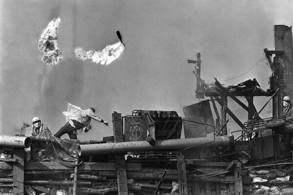 ウクライナ戦争から1年、終わりの見えない戦いは、日本での「成田闘争」が想起される。写真は1971年9月30日、機動隊めがけて火炎瓶を投げる学生(写真:AP/アフロ)