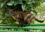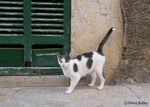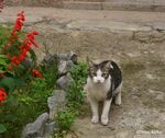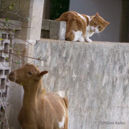 猫が、不思議そうな顔をして、塀の上から山羊を見つめていました。背中に乗ってみたらどうなるのだろうと考えているように見えました。