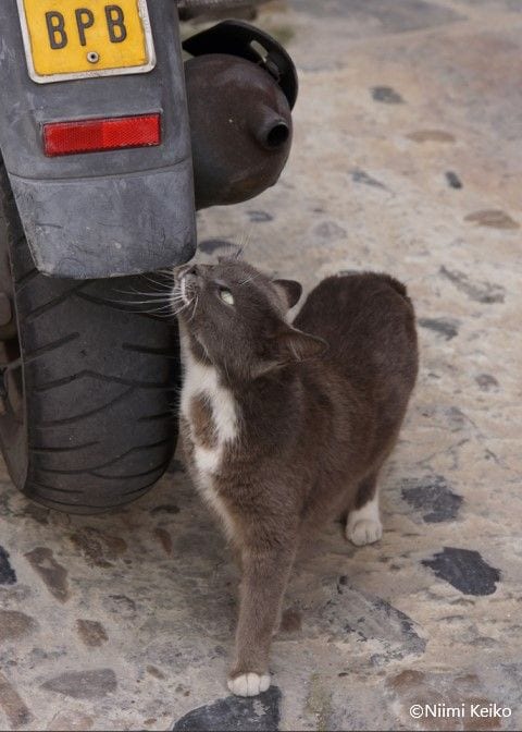 「きれいな猫ちゃん、胸に大きなブローチをつけているの?」と話しかけると、バイクに頬をすり寄せて、胸の柄をよく見えるようにしてくれました。もしかしたら、家の人からも同じことを言われているのかもしれません。