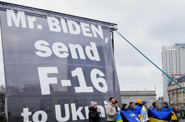 ウクライナを電撃訪問し、ポーランドに立ち寄ったバイデン大統領に向け、F-16の供与を求めて気勢を上げる人々(2月22日、ワルシャワのバイデン大統領のホテル前で、写真:ロイター/アフロ)