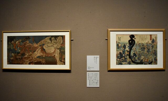 左から、国芳《赤沢山大相撲》、《浮世よしづくし》ともに浅井コレクション