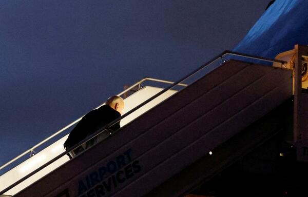 キーウ電撃訪問後にポーランドから帰国する際、エアフォースワンのステップに躓いてしまったバイデン大統領(2月22日、写真:ロイター/アフロ)