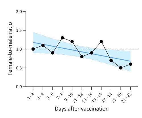 これは厚生労働省が発表したデータを用いて、ワクチン接種後早期の死亡例の男女比を調べたものだ。接種後1週間以内は女性のほうが高いが、1週間を過ぎると男女比は逆転する。つまり、死亡率は時間の経過とともに変化していた。この変化は統計的に有意であり、偶然の影響では説明できない。