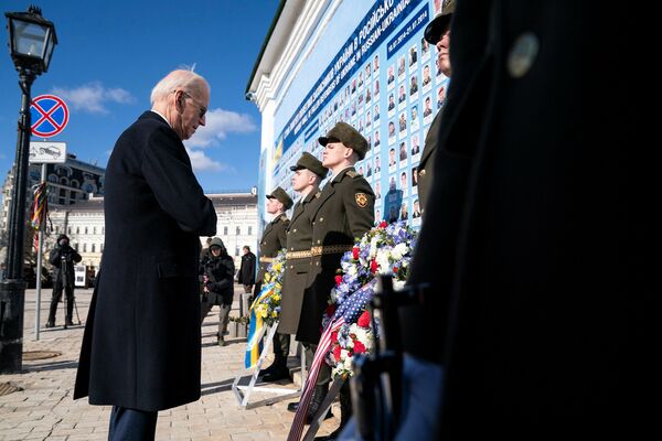 ウクライナの首都キーウを電撃訪問した米国のジョー・バイデン大統領(2023年2月20日、写真:代表撮影/ロイター/アフロ)