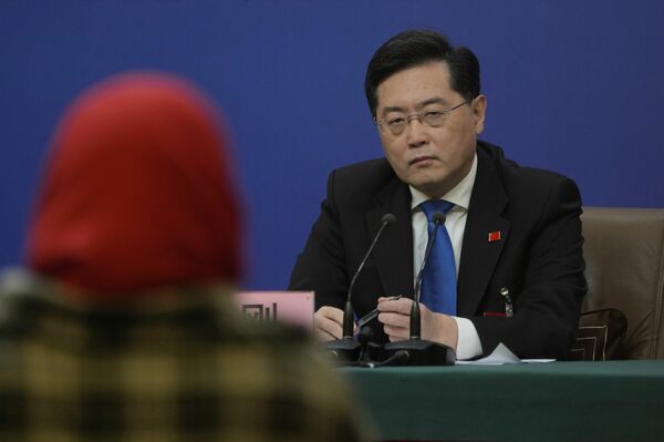 全人代の会見で記者からの質問に答える中国の秦剛外相(2023年3月7日、写真:AP/アフロ)