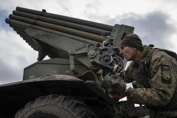 3月9日、ウクライナ東部ルハンシク州クレミンナで、ロシア軍の陣地に向け自走多連装ロケット・システム「BM-21グラド」での攻撃準備をするウクライナ軍・第95独立空中強襲旅団の兵士(写真:AP/アフロ)