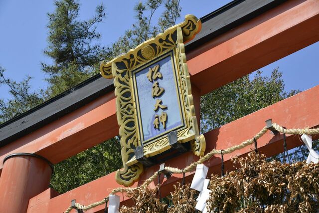 主祭神は大山咋神。この神は滋賀県比叡山の麓にある日吉大社祀られている大きな山を所有する神で、農耕、酒造なども司る。この神社が創建されたのは飛鳥時代とされるが、それよりはるか以前から、このあたりには人の暮らしがあった。彼らは、現在もご神体山とされる松尾山の山頂付近の磐座にこの神を祀り、土地の守護神としていたという。