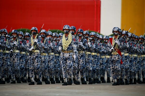 昨年3月27日、ミャンマーの首都ネピドーで開催された国軍記念日の軍事パレードで行進する兵士たち(写真:新華社/アフロ)