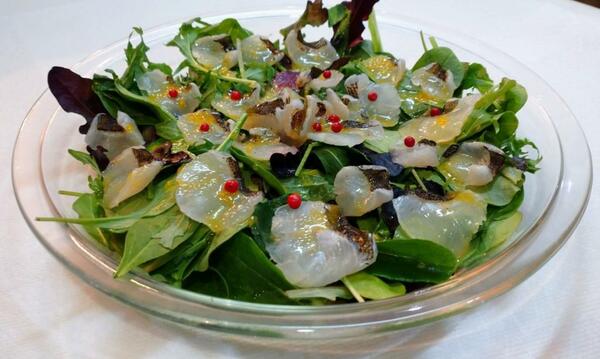 皮目を炙ったメバルのカルパッチョ・オレンジドレッシングとともに(写真はすべて筆者撮影)