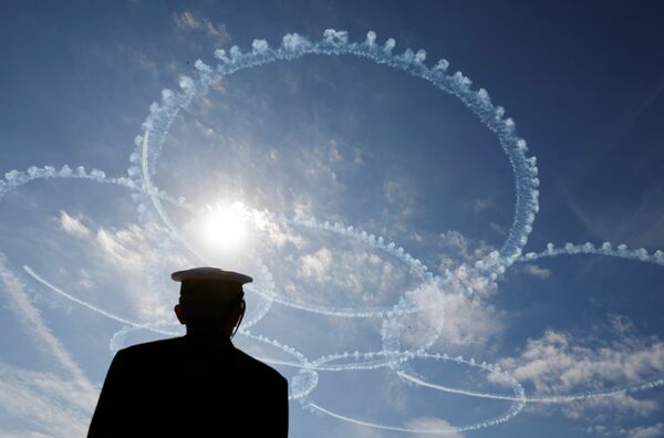 海上自衛隊創設70周年を記念して行われた国際観艦式で曲技飛行を見せる航空自衛隊の「ブルーインパルス」(2022年11月6日、写真:代表撮影/ロイター/アフロ)
