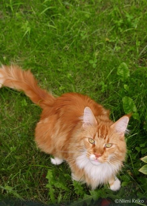 大きくて派手な毛並みのメインクーンに会いました。「あなたはメインクーンでしょ?」と言うと、メインクーンという言葉を聞き慣れているようで、「そうだよ」とこちらをじっと見てくれました。