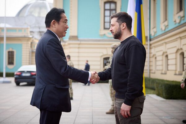 3月21日、キーウを訪問し、ゼレンスキー大統領と握手を交わす岸田文雄首相(提供:Ukrainian Presidential Press Service/ロイター/アフロ)