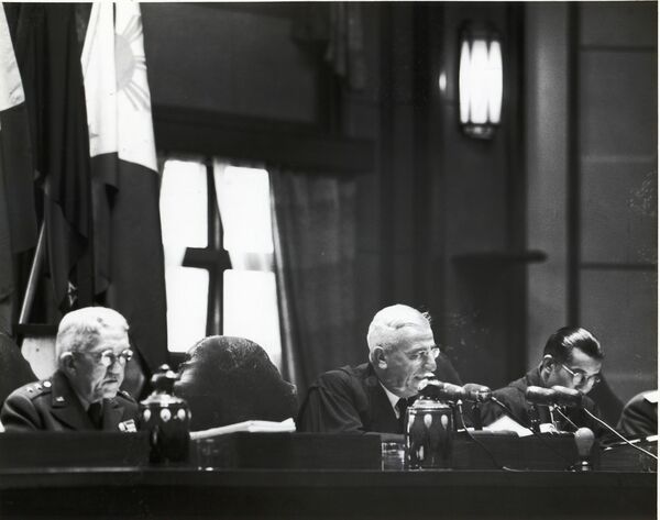 極東国際軍事裁判。再開された法廷2日目、主要戦犯容疑者に対し判決文を読み上げるウィリアム・ウェブ裁判長(中央)(資料写真、1948年11月5日、写真:近現代PL/アフロ)