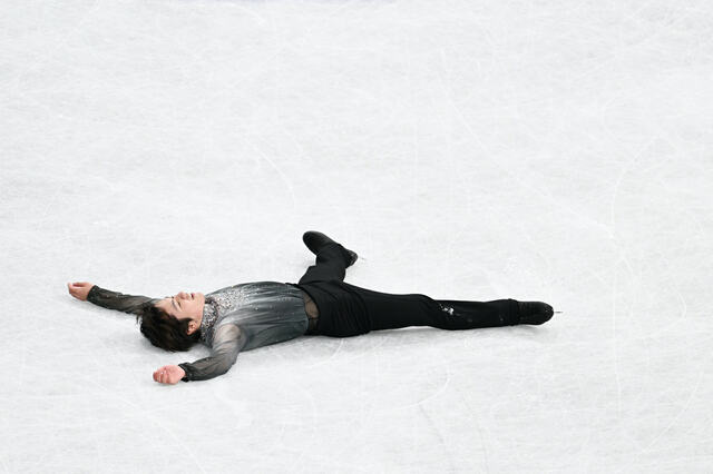 フィニッシュするやいなや、宇野は氷上に大の字に伸びた。精魂使い果たしたことがその姿にあった。