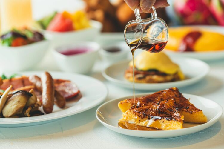 朝食はビュッフェスタイルの「オールデイダイニングセラーレ」で、「瀬良垣フレンチトースト」をぜひ。ふわとろ食感の絶品です。