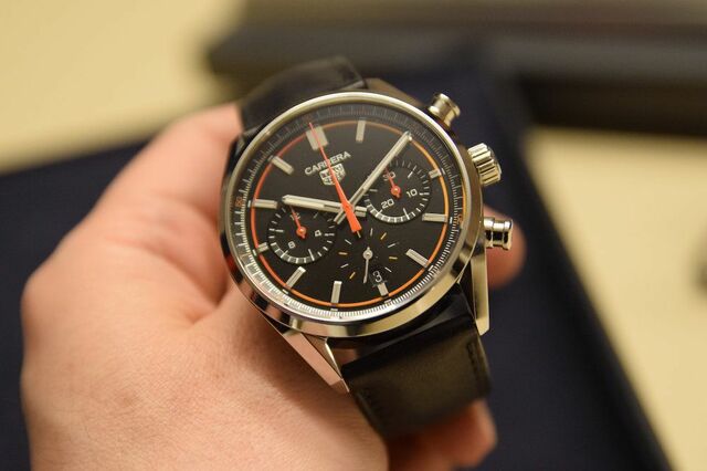 福留 『カレラ TH20-00 クロノグラフ グラスボックス』ですね。シンプルな初代に近いデザインですよね。見た目の大きな違いは外周にタキメータースケールがついたこと。それからデイト表示ですね。それ以外はグローブをはめたままでも操作できる大きなリューズやボックス型の風防など、わりと忠実に再現しています。2モデルあって、こちらはブラック文字盤ですね。僕は個人的にこっちの方が好きなんですが。